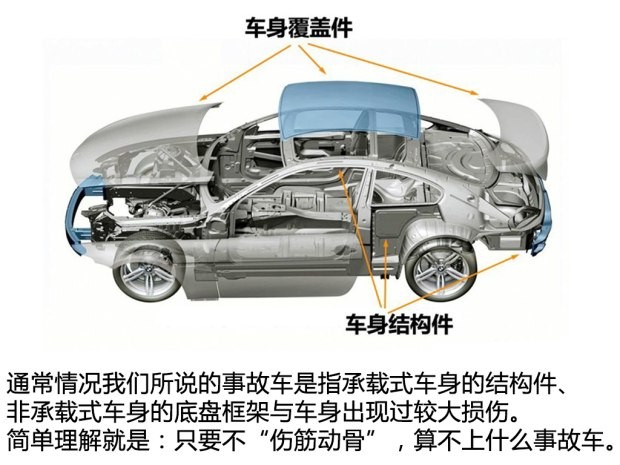 事故车是指承载式车身的结构件、非承载式车身的底盘框架与车身出现过较大损伤。